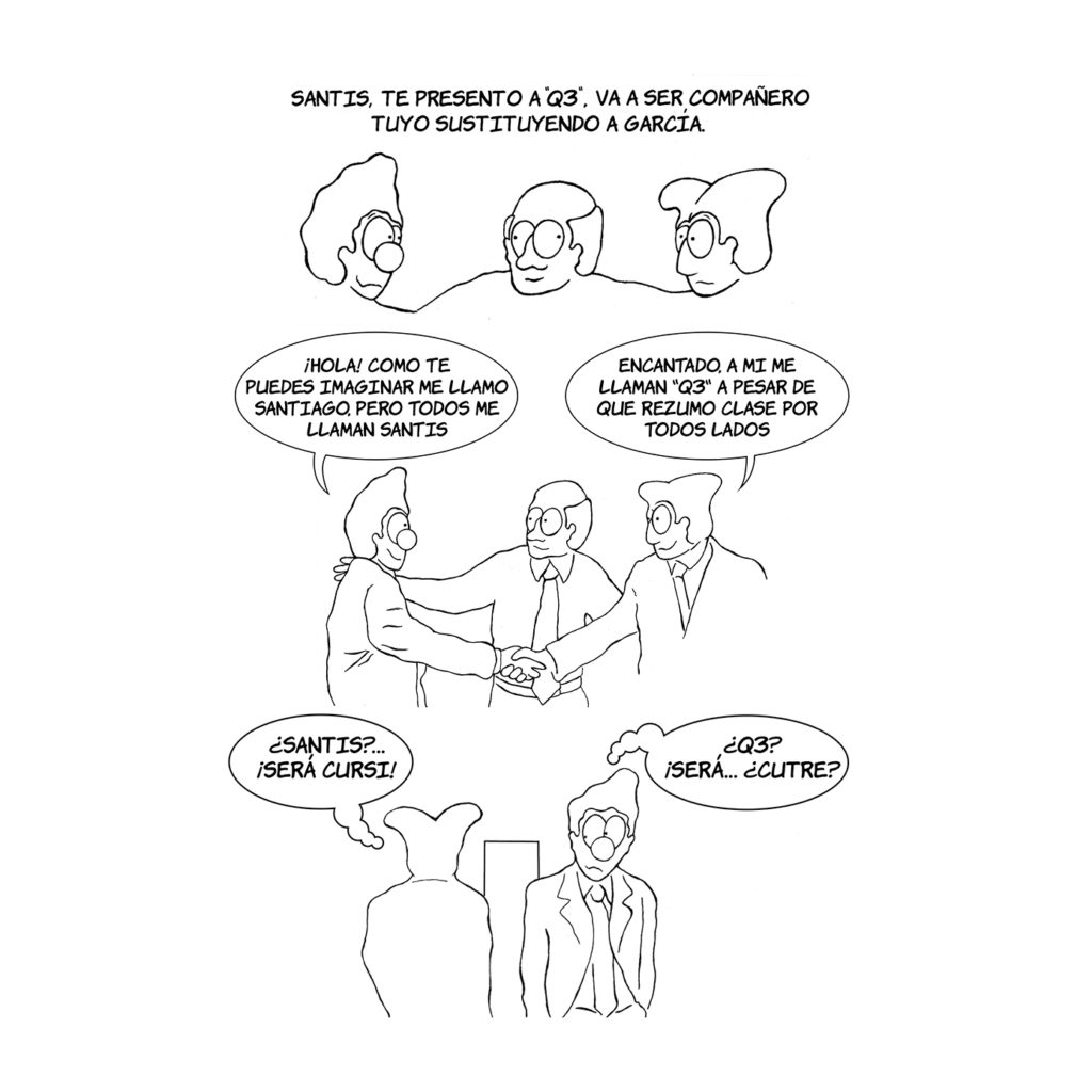 Santis y Q3 disfrutan su mirada de la realidad. Se divierten viendo la parte absurda y sin sentido, llena de pretensiones, de pensamiento lógico, racional y pretendidamente estratégico de la empresa. Nuestros amigos reflexionan sobre su propio nivel de motivación, su compromiso con la empresa y con su tarea. Discuten sobre el sentido del trabajo y no pueden dejar de opinar sobre los diferentes personajes que pueblan la empresa. Los habitantes del medioambiente en el que se mueven y en el que han aprendido a sobrevivir.